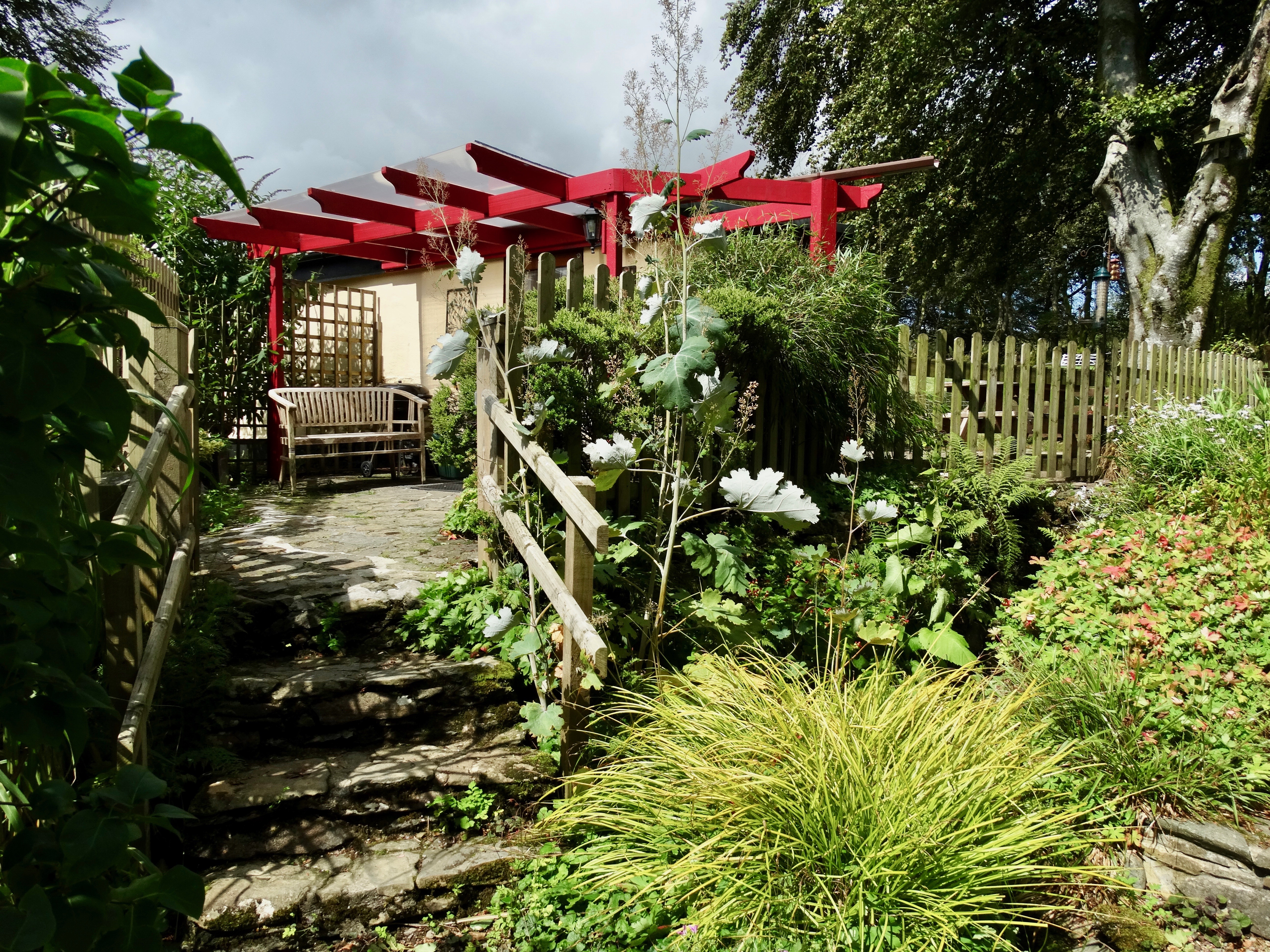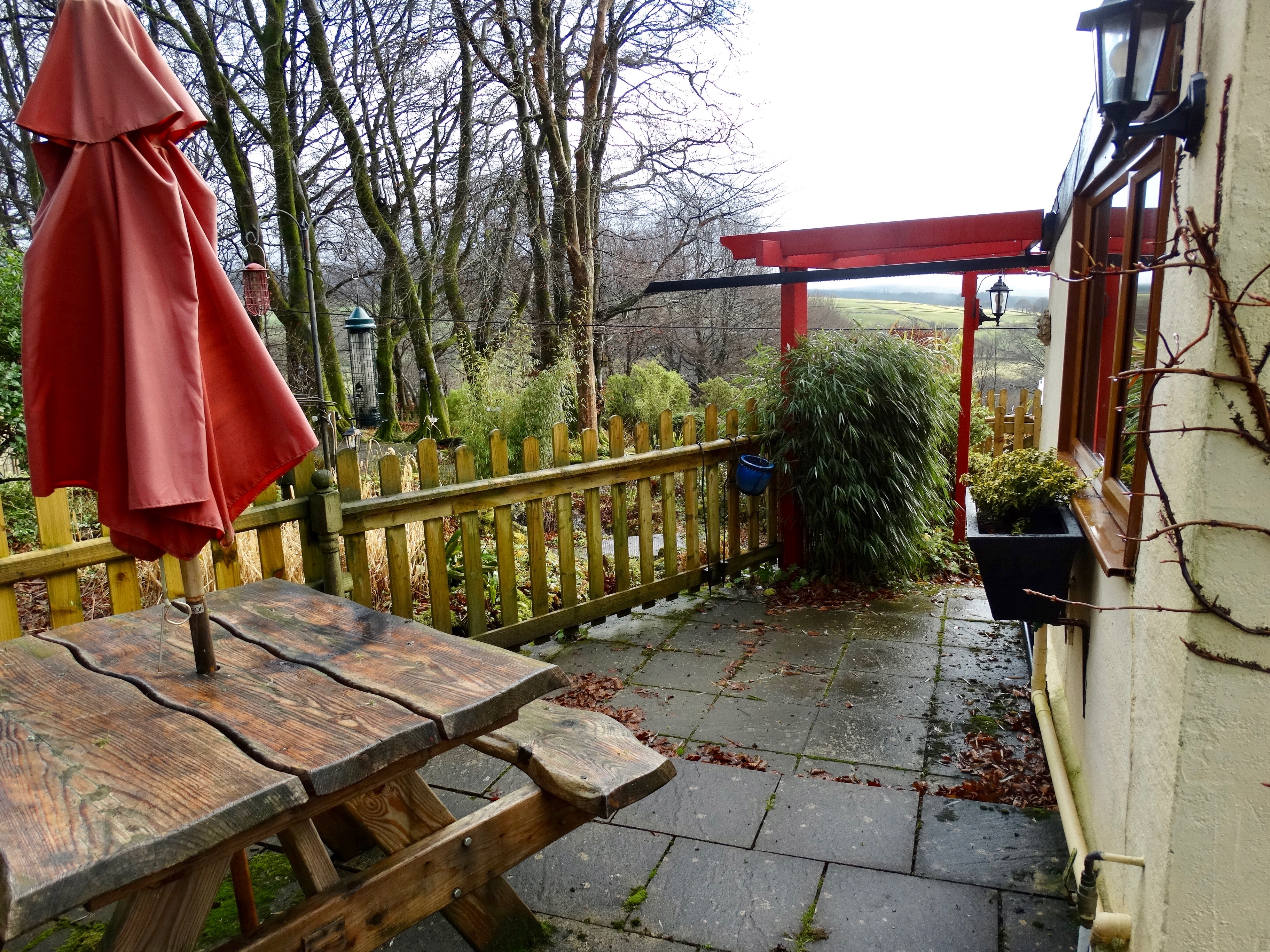 There are four stone steps leading up to the Cottage which is then all on one level. Large patio area with table and benches, BBQ and with a surrounding wooden fence and gate over the steps.