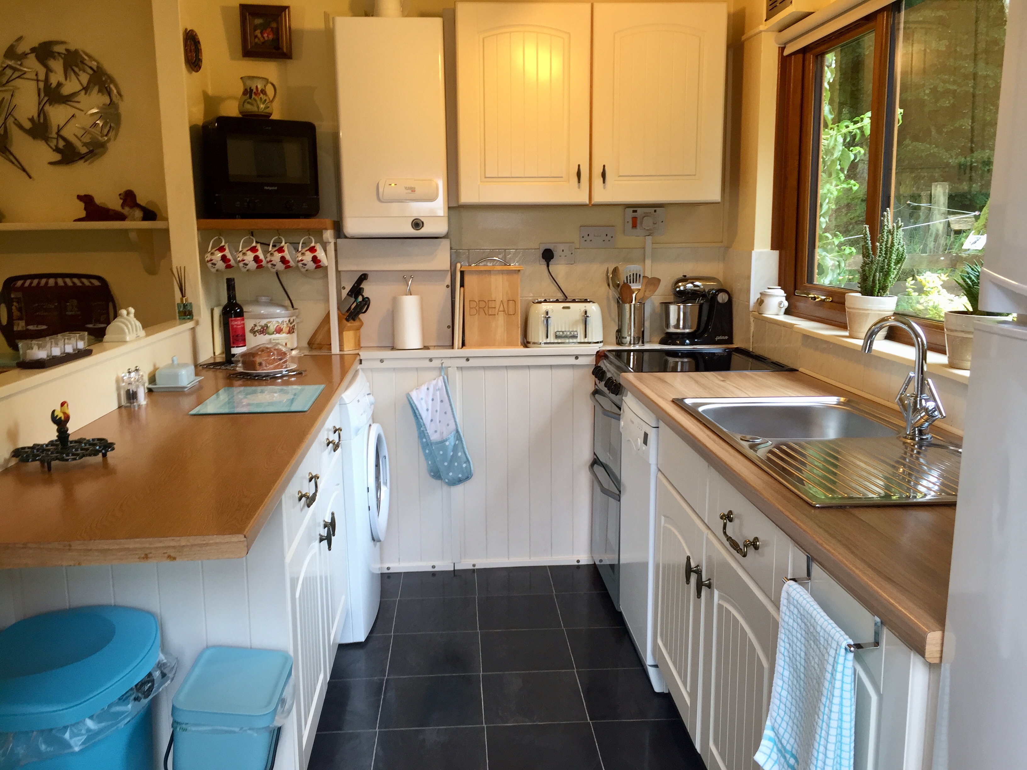 The Kitchen is equipped with: fridge-freezer, gas hob, electric oven & grill, microwave, slow cooker, dishwasher, all china, crockery, pots, pans and utensils, iron & board, washing machine, cleaning products, in fact everything you should need! Just outside the kitchen window is an extremely busy nut feeder making even washing up a pleasure!